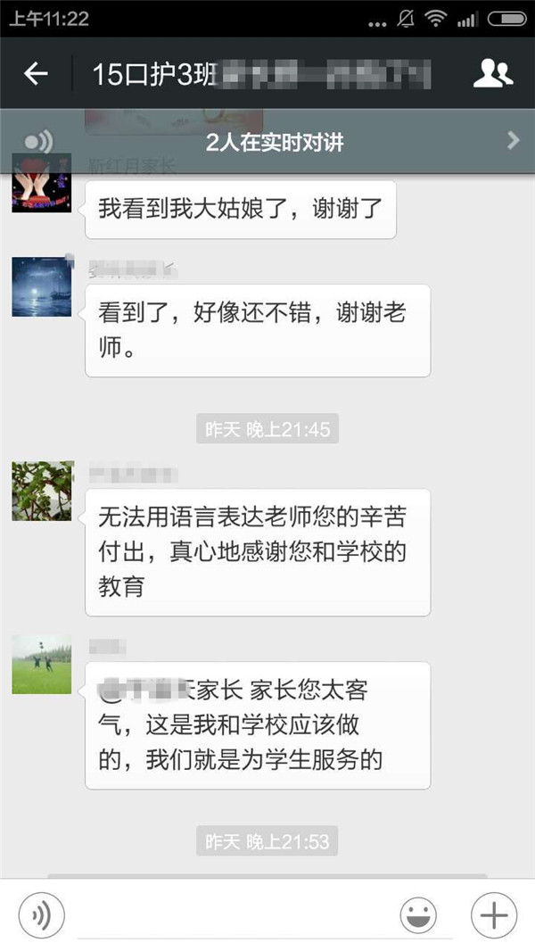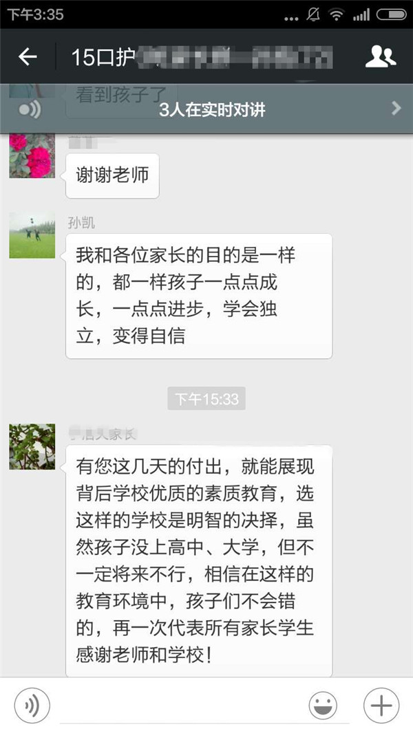 在與家長(zhǎng)們建立的微信群中,班主任不放過任何一條家長(zhǎng)發(fā)送的信息,不論多忙,不管多累,他們都及時(shí)回復(fù),他們這樣說:“回到家里,我們也是孩子的爸爸媽媽,所以我們特別理解家長(zhǎng)的心情。第一次讓孩子獨(dú)立生活,孩子吃得怎么樣、住得怎么樣、軍訓(xùn)累不累,這些都是家長(zhǎng)們關(guān)注的,也許我們一句簡(jiǎn)短的‘請(qǐng)放心’,一張孩子軍訓(xùn)的照片,就能讓家長(zhǎng)安慰許久,這也是對(duì)孩子們獨(dú)立的默默鼓勵(lì)。所以,我們不能懈怠,我們對(duì)一個(gè)家長(zhǎng)懈怠了,就會(huì)傷到一個(gè)家長(zhǎng)甚至孩子的心?!?/span>